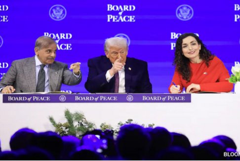 巴基斯坦總理謝赫巴茲·謝里夫、美國總統(tǒng)唐納德·特朗普和科索沃總統(tǒng)維約薩·奧斯馬尼-薩德留 (LR)