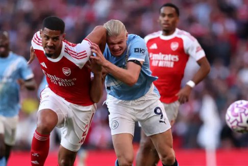 2025年9月21日,在酋長球場(chǎng)舉行的英超聯(lián)賽阿森納對(duì)陣曼城的比賽中,威廉·薩利巴與埃爾林·哈蘭德爭(zhēng)搶球權(quán)。